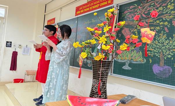 Diễn ra trong không khí những ngày giáp Tết, tiết học được tổ chức sinh động, giàu tính trải nghiệm. Không gian lớp học được trang trí với hình ảnh hoa mai, hoa đào, bánh chưng, bao lì xì – những biểu tượng đặc trưng của ngày Tết cổ truyền. Nhiều học sinh mặc áo dài truyền thống, tạo nên một bức tranh xuân rực rỡ, đậm đà bản sắc văn hóa Việt Nam.