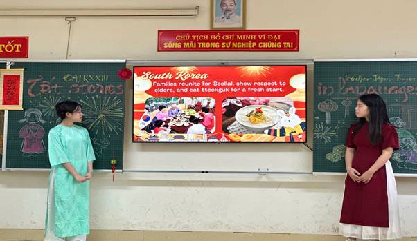 Điểm nổi bật của tiết học là chuỗi hoạt động đa dạng, kết hợp hài hòa giữa kiến thức ngôn ngữ và trải nghiệm văn hóa. Các nhóm học sinh tự tin thuyết trình bằng tiếng Anh về phong tục, tập quán ngày Tết; phân tích ý nghĩa của hoa mai, hoa đào trong đời sống tinh thần người Việt; trình bày về các hoạt động truyền thống như gói bánh chưng, chúc Tết, lì xì đầu năm. Việc sử dụng tiếng Anh để diễn đạt những giá trị văn hóa quen thuộc đã giúp học sinh nâng cao năng lực giao tiếp trong bối cảnh thực tiễn, đồng thời củng cố sự hiểu biết và niềm tự hào về truyền thống dân tộc.
