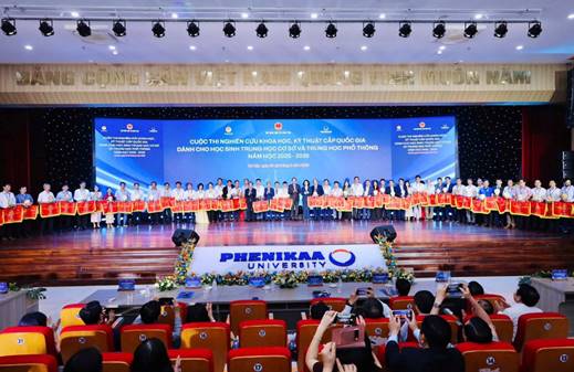 Ảnh 1. Lãnh đạo Bộ GD&ĐT, Thành phố Hà Nội và Đại học Phenika trao cờ lưu niệm cho 51 đơn vị tham gia Cuộc thi năm nay