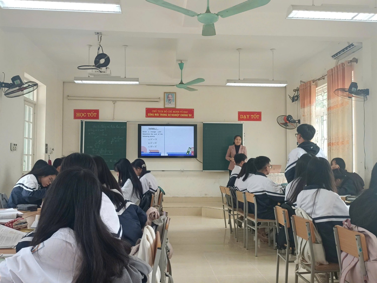 Tổ Toán – Tin đã triển khai ba hình thức chính: Lồng ghép thuật ngữ Toán bằng tiếng Anh trong từng nội dung giảng dạy, khuyến khích học sinh ghi nhớ song ngữ; Phát triển hệ thống bài toán song ngữ, giúp học sinh rèn luyện khả năng đọc – hiểu – phân tích bằng tiếng Anh; Dạy một phần bài học bằng tiếng Anh kết hợp trình chiếu, bảng tương tác hoặc video minh họa được hỗ trợ bởi các công cụ AI.